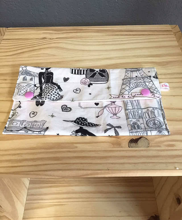 Pochette plate tissus imprimé et uni oeko tex, fermée par pression, collection moi Paris