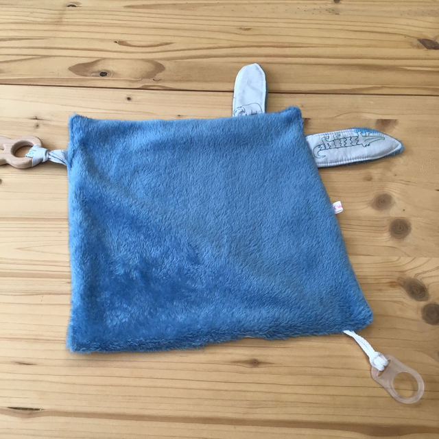 Doudou Tissus coton oeko tex, au dos tissus doudou oeko tex, avec accroche en silicone, sans substance nocive, pour la suce, et un anneau de dentition en bois non traité.